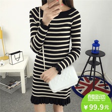 2017春季新款韩版条纹花边打底中长款打底衫毛衣上衣毛衣裙打底裙