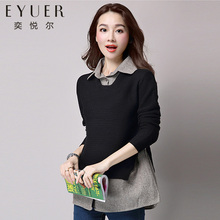 2016秋季新款女装针织衫套头衫拼接衬衣女修身显瘦假两件套毛衣潮