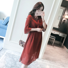 2017夏装新款中袖雪纺连衣裙荷叶边V领显瘦长裙大码女装收腰裙子
