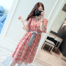 大码女装胖妹妹夏装短袖收腰显瘦连衣裙红色碎花长款裙子