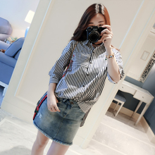 大码女装衬衫2017夏装新款条纹衬衣胖妞上衣休闲胖妹妹胖mm200斤