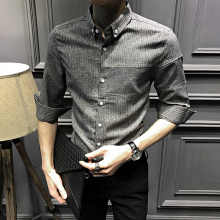 夏季新款男士五分袖衬衫时尚条纹修身寸衫韩版帅气七分袖衬衣中袖