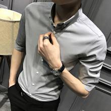 夏季灰色五分袖衬衫男士韩版修身新款休闲寸衫男装纯色中袖衬衣