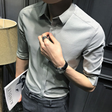 男士中袖衬衫韩版修身纯色中袖衬衣青年时尚夏季寸衫休闲七分袖