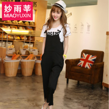 妙雨莘2016新款韩版女装宽松显瘦小脚连体裤夏九分背带裤女两件套