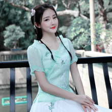 曼轻罗复古汉唐风小清新v领木耳边修身短袖t恤绣花文艺上衣衬衫