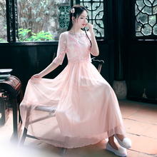 曼轻罗新品复古文艺优雅气质盘扣绣花中长款连衣裙