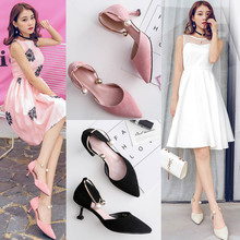 包头凉鞋女夏2017新款中跟百搭高跟鞋学生一字扣尖头细跟猫跟鞋女