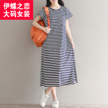 加肥加大码女装夏装新款长裙 胖MM妹妹宽松显瘦纯棉条纹连衣裙女