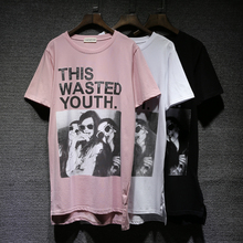 中长款纯棉t恤女短袖 夏季宽松韩版大码上衣美女印花开叉打底体恤