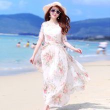 大码海边度假波西米亚长裙沙滩裙印花碎花短袖雪纺显瘦飘逸连衣裙