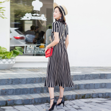 2017夏装新款女装竖条纹雪纺连衣裙短袖显瘦a字百褶裙子仙气长裙