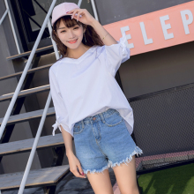 2017夏季宽松蝴蝶结七分袖衬衫女学生套头白色韩版时尚上衣中长款