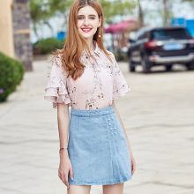 2017夏季新款品牌女装系带V领绣花短袖上衣休闲百搭女式衬衫