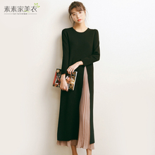 韩国气质长袖连衣裙超仙女假两件套撞色开叉长裙不规则复古针织裙