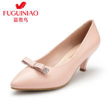 富贵鸟春季尖头女鞋 单鞋女中跟真皮皮鞋工作鞋女黑色细跟蝴蝶结