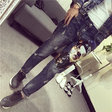 2016欧洲站秋季新款狗狗亮片烫金破洞低腰牛仔裤女九分小脚裤女潮