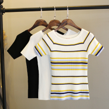 性感一字领冰丝针织条纹短款短袖修身T恤女 纯色打底女上衣 薄 夏