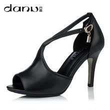 丹露2016春新品韩版牛皮高跟女鞋细跟透气纱网缕空鱼嘴女凉鞋
