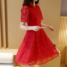 夏装甜美淑女中长款蓬蓬红裙子短袖修身显瘦大红色蕾丝连衣裙女