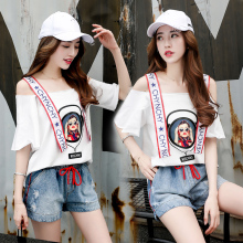 套装女2017夏季新款女装一字肩印花短袖气质百搭牛仔短裤两件套潮