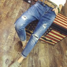 送网袜BF风破洞牛仔哈伦裤女2017夏季新款宽松显瘦九分裤乞丐裤潮
