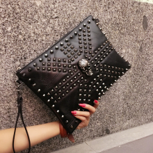 个性骷髅头铆钉手拿包女 新款软皮单肩中包 时尚韩版信封包大容量