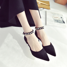 高跟鞋细跟2017春季新款韩版百搭一字扣珍珠绒面单鞋尖头浅口凉鞋