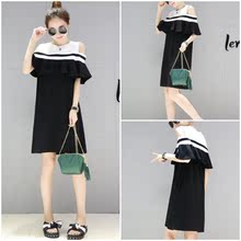 欧洲站2017夏季新款时尚短袖漏肩显瘦中长款连衣裙A字裙大码裙子