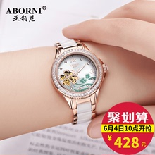 新款正品亚铂尼手表女士全自动机械表女表镂空真皮带时尚陶瓷防水