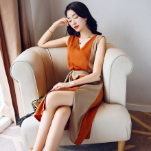 时尚潮女双色拼接长款显瘦连衣裙 夏季新款V领无袖连衣裙