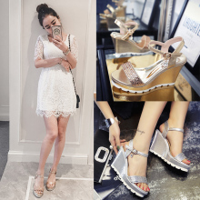 春夏新款凉鞋女时尚水钻露趾坡跟凉鞋防水台高跟鞋厚底大码凉鞋