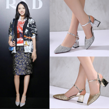 高跟鞋女新款春夏欧美亮片粗跟凉鞋尖头银色一字扣中空鞋浅口单鞋