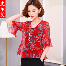 皮尔芙2017夏季新款V领宽松印花短袖喇叭袖雪纺衫荷叶边上衣女
