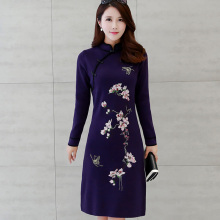 2017春季新款长袖旗袍针织衫连衣裙中长款女装复古中国风绣花毛衣