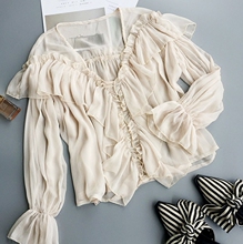 MOSS定制2017夏季V领宽松露肩荷叶边灯笼袖雪纺衫上衣女薄AM74008