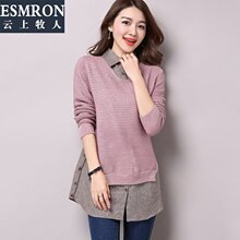 2016秋冬新款韩版女士上衣假两件套头毛衣大码宽松外穿打底针织衫
