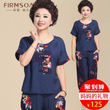 妈妈夏装套装40岁50中年女春装运动中老年时尚棉麻上衣短袖两件套