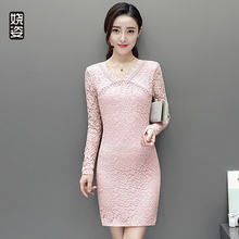 娆姿2017春装新款V领蕾丝包臀连衣裙女中长款修身百搭长袖打底衫