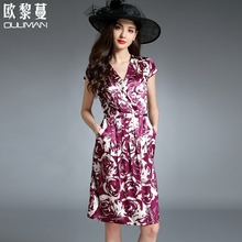 欧黎蔓2017夏季新款时尚印花真丝连衣裙V领修身腰带桑蚕丝中长裙