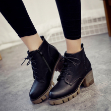 秋冬新款女靴子厚底高跟鞋粗跟短靴马丁靴短筒系带加绒保暖女靴子