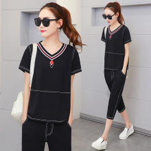 运动套装女2017夏季新款韩版短袖休闲V领时尚大码七分裤两件套潮