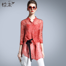 惊束衬衣夏新款大码真丝拼接衬衫女中长款条纹显瘦宽松上衣桑蚕丝