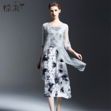 惊束夏季女装桑蚕丝复古真丝拼接长裙水墨画中国风中长款连衣裙女