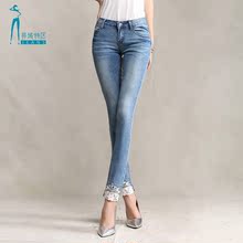 异域特区2017蕾丝边九分牛仔裤女春夏钉珠镶钻浅色铅笔小脚长裤子