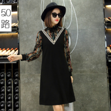 50路2017春装新款女装中长款长袖显瘦复古拼接针织连衣裙春秋裙子