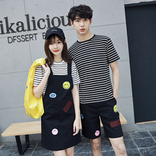 情侣装夏装套装2017新款韩版条纹短袖T恤男上衣夏季背带裙学生潮