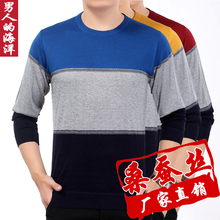 中老年桑蚕丝男T恤春装大码相拼男装中年男士宽松圆领长袖t恤衫男