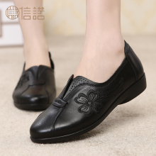 信诺春季妈妈鞋真皮休闲单鞋软底中跟粗跟中年浅口女鞋中老年皮鞋