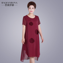 芭倩罗娜中老年妈妈夏装短袖雪纺印花宽松连衣裙中裙2017新款女装